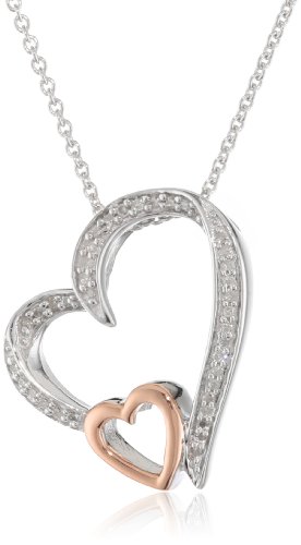 Make the 10k Rose Gold and Silver Diamond Double Open Heart Pendant a gift she'll cherish for years to come. Cast in 925 sterling silver, the heart-shaped pendant offer superior durable shine and measures .85 inches high. With a ribbon-like silhouette and a slight tilt, the heart is lined with a row of prong-set white diamonds of I2-I3 clarity. The 38 diamonds contain .1 carats and are complemented by a small accent heart at the bottom made from 10k rose gold. The pendant slides on its 18-inch sterling silver rolo chain which fastens with a convenient lobster-claw clasp. Give this necklace as a birthday or Valentine's Day gift to show your love and affection.