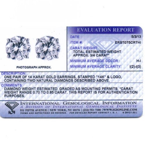 IGI certified 3/4ct diamond stud earrings set in 14k white gold settings with screw backs. These are H-I color ( near colorless).