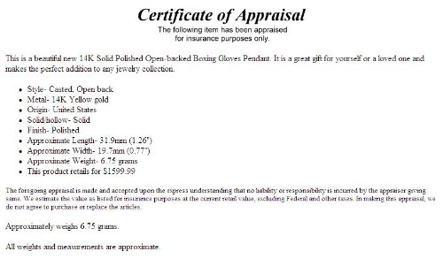 This is a beautiful new 14K Solid Polished Open-backed Boxing Gloves Pendant. It is a great gift for yourself or a loved one and makes the perfect addition to any jewelry collection. Style- Casted, Open back Metal- 14K Yellow gold Origin- United States Solid/hollow- Solid Finish- Polished Approximate Length- 31.9mm (1.26″) Approximate Width- 19.7mm (0.77″) Approximate Weight- 6.75 grams Approximately weighs 6.75 grams.