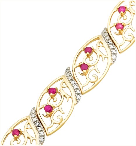 Fiery ruby accents add color to this elegant filigree link bracelet. Small diamond rounds pattern with each gold link and add additional shine to this elegant silhouette.