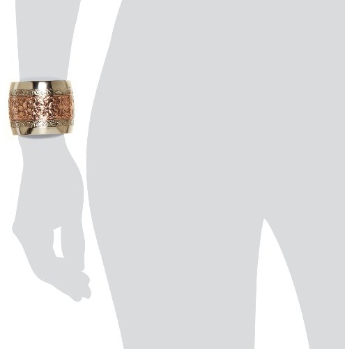 The 1928 Boutique Prominence Silver-Tone and Copper Cuff Bracelet features classic etching with a modern shape. The cuff offers a copper-toned, center portion that is etched with a lovely and elaborate flower motif. The outer portion is made from silver-toned metal for a nice contrast. The cuff is two inches wide for a bold look and pairs well with anything in your wardrobe. It's seven inches in length, but the open-ended cuff allows it to fit all wrist sizes.