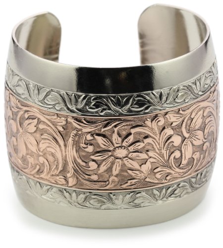 An exquisite cuff bracelet demonstrating the beauty of art with a two toned silver and copper tone finish under a romantic floral etched design.