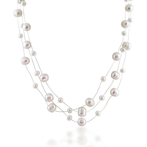 Add a little shimmer and radiance to your look when you wear our stunning three strand pearl necklace. The special piece features freshwater pearls of varying sizes that are strung on an almost translucent fiber, along three strands. This gives the piece of bridal jewelry an illusion that the pearls seem to be floating in mid air. An illusion necklace makes a sensational choice for a wedding or a special night out. At this very affordable price, order one for a friend who celebrates a June birthday and give her a gift of June birthstone jewelry that will make her happy and fashionable.