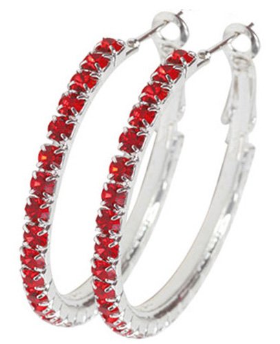 Diamond Hoop Earring - Silver w/ Red Cubic Zirconias - Cubic Zirconia Studded...