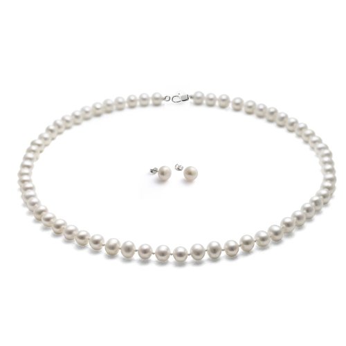 Ellena Pearl Round 6.5-7mm 18Inches 45cm Freshwater Cultured White Pearl Necklace for Women & Matching Stud Earring Set as a FREE Gift