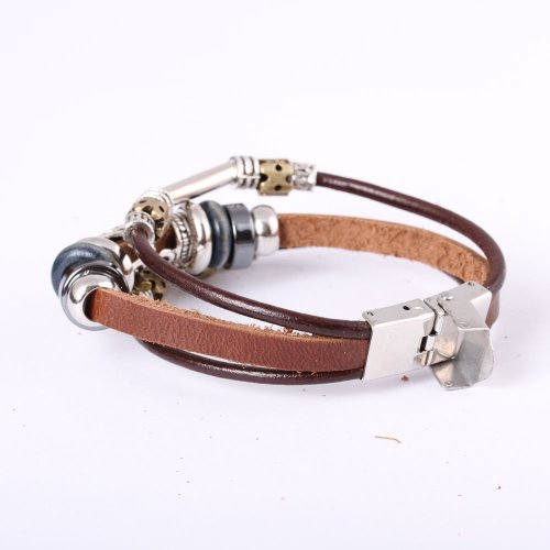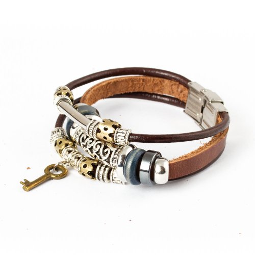 Great looking three-strand leather bracelet has one leather strand embellished with a brass key drop accented with metallic beads on each side, and gunmetal beads. The other two leather strands each has a steel tube. The leather bracelet measures 19mm in length with a safety stainless steel clasp.