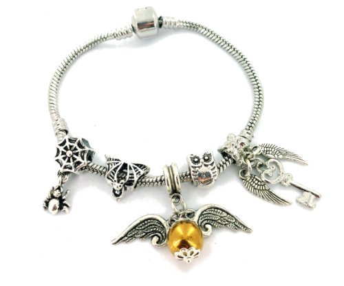 A beautiful harry potter inspired charm bracelet the bracelet measures 18cm please be sure to check sizing before ordering. The bracelet will fit most pandora/european style charms and the charms are interchangeable . The charms on the bracelet include a handmade golden snitch charm, a hedwig charm, a Griffins head charm, a magic flying key charm and Harry's glasses charm. The charms are free moving and turn on the bracelet.