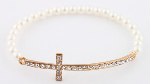 Ladies Gold Iced Out Slim Cross with Beads Stretch Bracelet