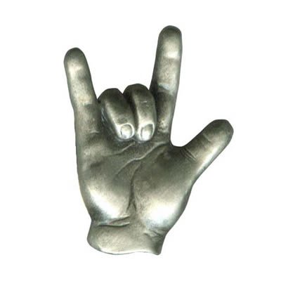 This tie tack / tie pin displays a hand signing in American Sign Language “I Love You”.