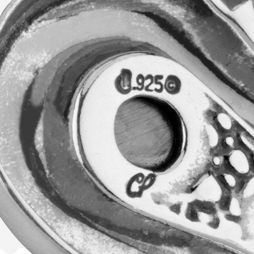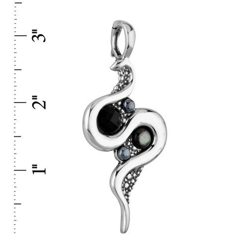 The most hidden, mysterious of all creatures comes to life in this sinuous free form enhancer. A polished genuine .925 sterling silver snake is accented by natural faceted onyx, round hematite, and abalone shell gemstones scattered along a sterling silver pebble texture background finishing with a snap hinge bail. This sinfully stunning enhancer measures 3-1/4″ L x 1-1/2″ W. Bail measures 9 x 11mm. Sterling silver weight approximately 22.43 grams.