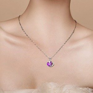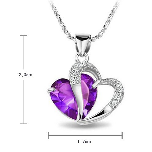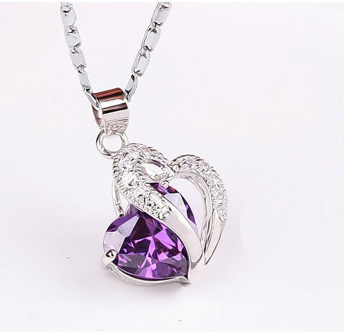 Rhodium plated 925 silver diamond amethyst crystal heart shape pendant charm jewellery 45 cm chain necklace