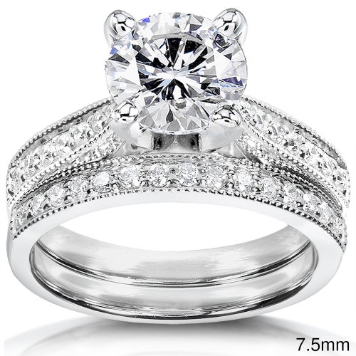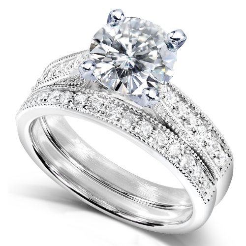 Round Moissanite (1 1/2ct DEW) and Diamond Wedding Ring Set in 14k White Gold - Size 5.5