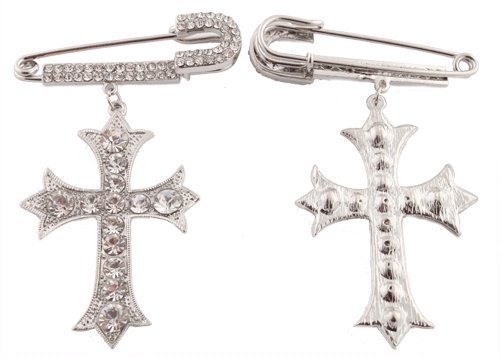 Silver with Clear Iced Out Safety Pin with Dangle Pattee Cross Brooch & Pin