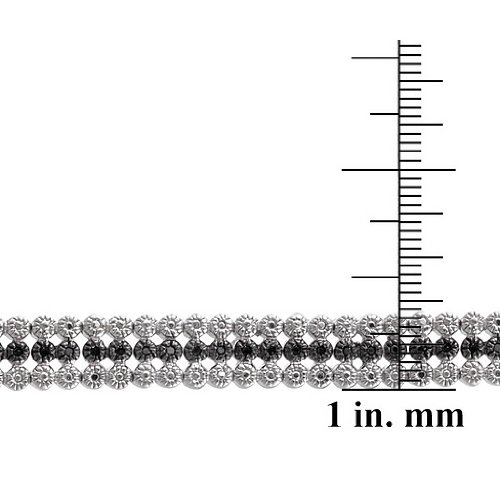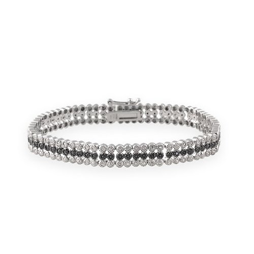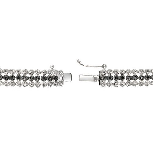 This glamorous three row tennis bracelet showcases a black and white themed design. It features a center row of shimmering genuine black diamonds and the outer rows sterling silver dotted detailing, simulating shimmering white stones. The bracelet is secured by a box tongue with a safety clasp and is crafted of sterling silver. Total diamond weight: 3/4ct.