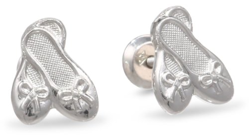 Little ballerinas will delight in these charming ballet shoe earrings. Crafted from genuine sterling silver, the earrings are smooth and flat and measure approximately 1/4 to 3/8 inch in diameter. They feature a combination of polished and matte surfaces and are beautifully detailed, right down to the little bows across the toes. Parents will appreciate the smart threaded post and screw-on back design, which keeps the earring backs in place to prevent lost earrings, and also ensures that the backs will not push too tightly against tender earlobes.