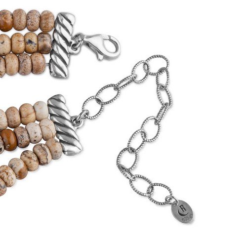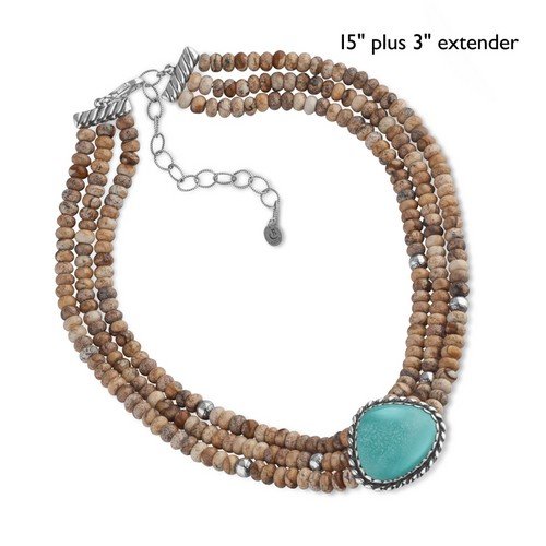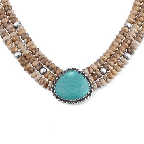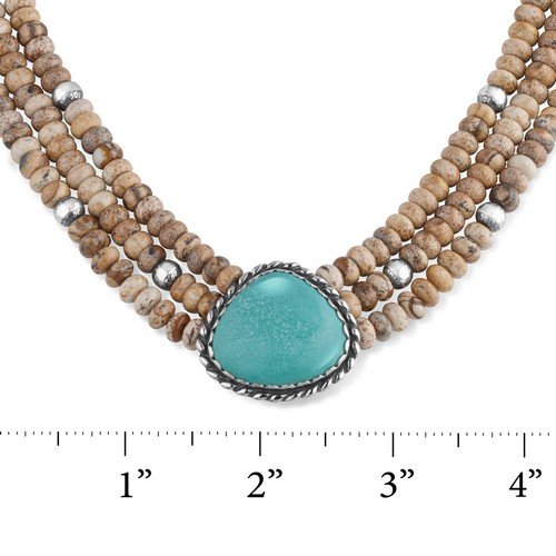 Make a beautiful, bold southwestern statement. Three earthy strands of picture jasper and sterling silver beads lead to a stunning cabochon of blue-green turquoise, framed by a sterling silver rope border. Measures 15″ L x 1″ W; adjustable to 18″ L with extender and features rope design end-caps, oval links, and lobster claw clasp of sterling silver. Celebrate the beauty of modern craftsmanship and the legacy of the American Southwest in eye-catching style.