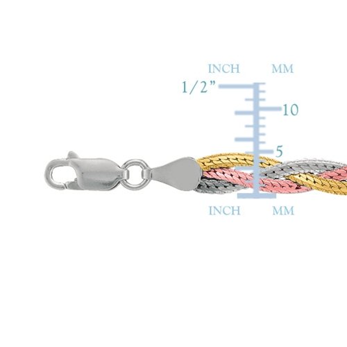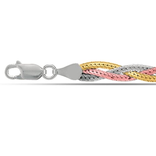Triple the look with this braided white, pink and yellow plated sterling silver snake anklet, adding on your summer look. The tricolor rhodium finished sterling silver encases the shimmering white look, giving it at the same time a better tarnish resistance. Available in a 10 inch length. Anklet comes in a complimentary gift packaging.
