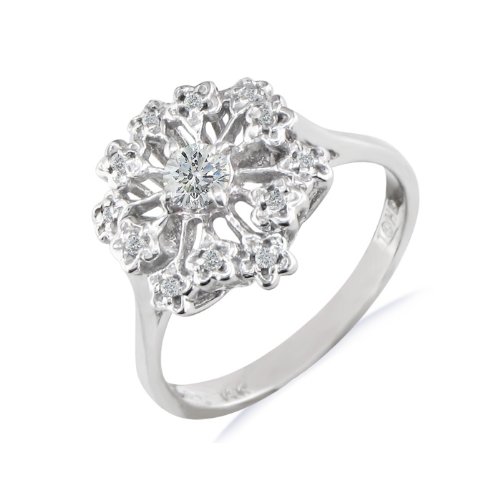 Pretty flower diamond right hand ring in 14 karat white gold. Ring contains 13 round brilliant diamonds in I/J color and SI3 clarity. Three Star Diamonds.