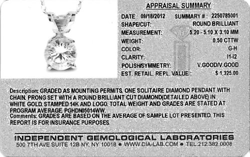 0.50 Carat Total Weight. White Diamond Solitaire Pendant With Chain. Color-G-H. Clarity- I1-I2. Polish- Very Good. Symmetry- Very Good. 14K White Gold. This is a Natural Diamond. Estimated Retail Value $1325.00.
