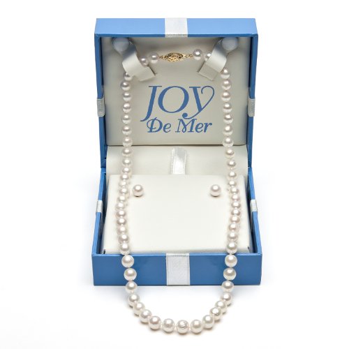 6.5-7.0mm, White Akoya Pearl Necklace and Stud Earring Set with 14k Yellow Gold in Gift Box