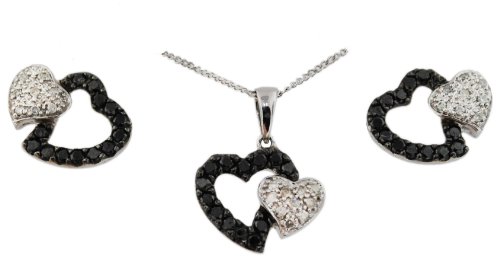 9ct White Gold 0.63ct Black and White Diamond Double Heart Stud Earrings and Pendant Set on Curb Chain Necklace 46cm/18"