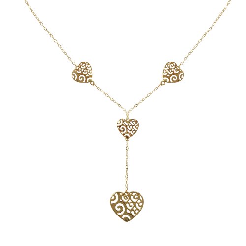 A fun, heartfelt accessory that glistens in gold, the 14k Yellow Gold Heart Ornament Y-Pendant makes a wonderful gift. Accented along a 17-inch gold chain are yellow-gold heart charms that contain swirling gold detailing throughout. The heart charms continue down the y-shape of the necklace which has the power to dress up even a simple t-shirt and jeans. The pendant is crafted out of the quality material used in all Duragold jewelry.