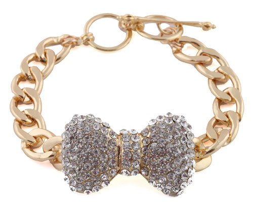Gold with Clear Iced Out Large 3D Bow 9 Inch Cuban Chain Link 12mm Adjustable Bracelet