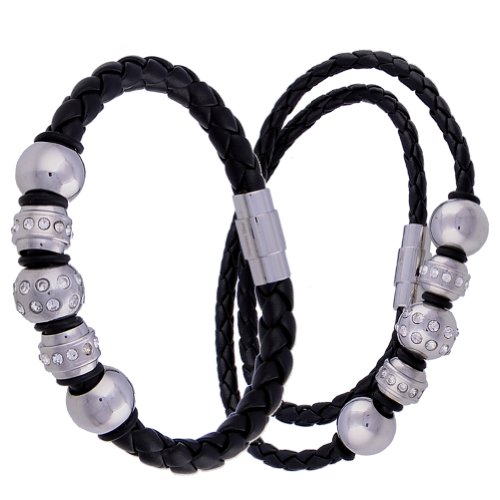 Kadima Leather Bracelet ,Leather Necklace ,Stainless Steel Pandora Beads ,Stainless Steel Braided PU with Steel Beads & Crystal Bracelet and Necklace Set, 6mm 8" Bracelet, 4mm 18" Necklace - Black