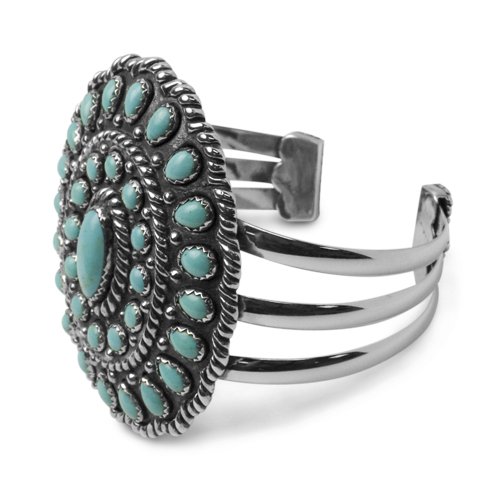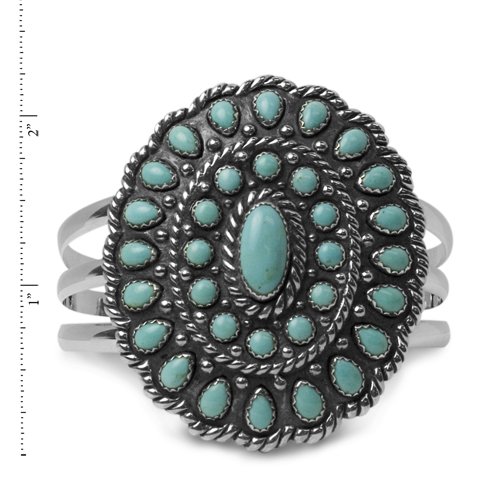 Blue-green Kingman turquoise bursts with color for a bracelet that makes a bold statement! The distinctly Southwestern styling and detailed sterling silver provide a perfect framework for blue-green turquoise stones from the Kingman mine in Arizona. A true collector's item, this bracelet features turquoise cabochons beautifully offset in sterling silver with scalloped edges, bead and rope-texture accents and an oxidized finish add a vintage look. Bracelet measures approximately 2-1/4″ W and fits most wrists with a 5-3/4″ inside circumference.