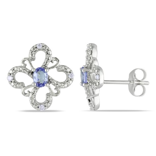 These pretty earrings are made with oval-cut tanzanite stones and round white diamonds set in 10-karat white gold. The stud earrings are secured with butterfly backs.