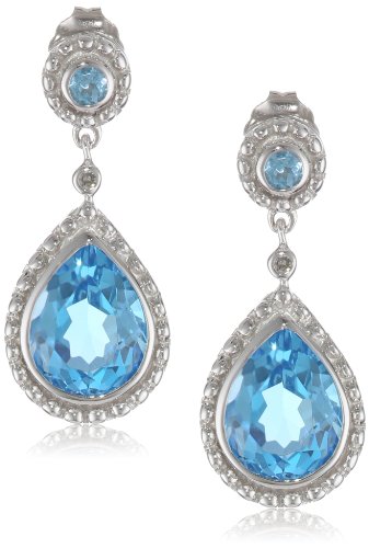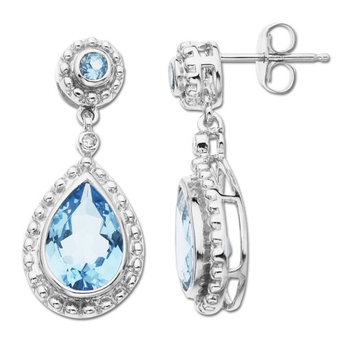 The bluest sky on the planet is no match for these elegant White Gold Blue Topaz and Diamond Drop Earrings. These pear-shaped gemstones are surrounded by a 14k white gold bead-textured bezel and feature a sparkling diamond between the post, which also includes a small round topaz (total weight 4.66c). The pair features a prong setting and 14k gold post with friction back. Sure to be loved by many, but for the person with a December birthday, these are an essential addition.