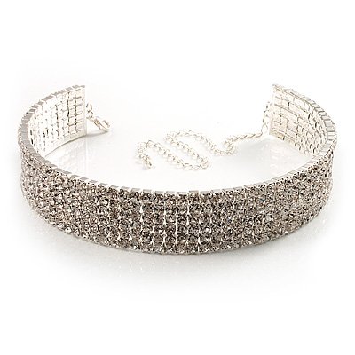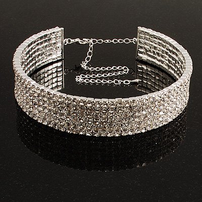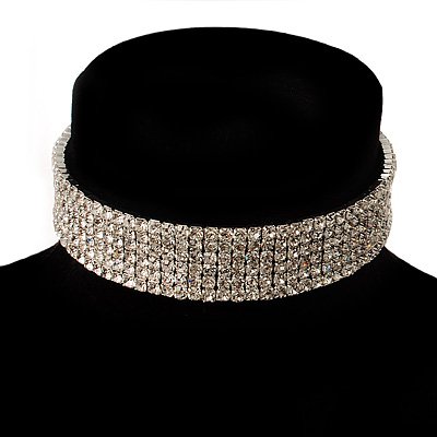 No amount of words or photographs could do justice to this exquisite 5-Row Swarovski Crystal Choker Necklace. Featuring a solid choker design, made of 6 rows claw-set clear crystals, crafted in shiny rhodium plated finish. This high quality 'piece' takes its inspiration from priceless diamond necklaces – the only thing missing is the 6 digit price tag. Easily mistaken for the real thing, this classic design is chic and stylish with the most dazzling sparkle. The necklace measures approximately 32cm in length, 3cm in width and has an additional 16cm extender that fastens with a lobster claw clasp.