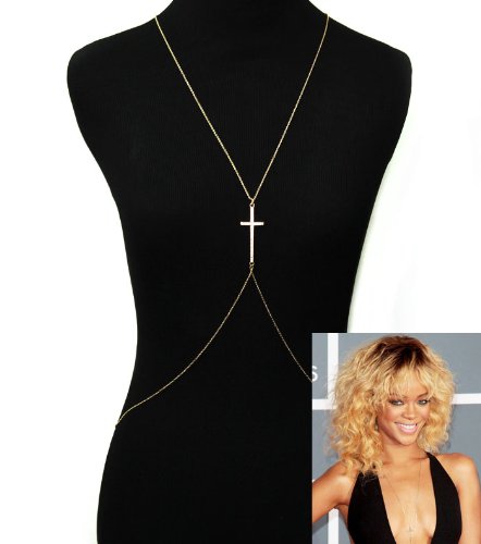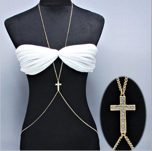 Body chain jewelry is one of the hottest celebrity trends out! Dare to be bold and get the look of Rihanna with this 16″ L drop necklace body chain accented with a center Small gold crystal 1.5″ cross. Wear this and you're bound to be the center of attention.
