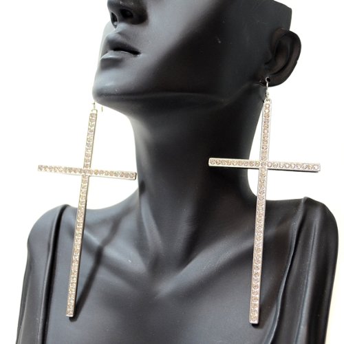 FASHION X-LARGE SILVER CROSS DANGLE EARRINGS WITH RHINESTONES 4.5 INCH