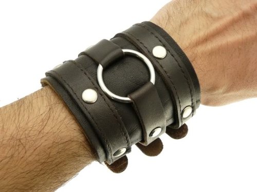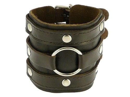 Made of real leather this bracelet combines both style with comfort. The leather cuff is approximately 7 cm wide. Has 5 holes for adjusting and is adjustable from approximately a maximum wrist circumference of 22 cm (8.5 inches) to approx 17 cm (6.75 inches). A cool looking Gothic style leather cuff bracelet. Please note the bracelet may not have the stitching on the straps as shown & the size of the studs and metal ring may vary slightly.
